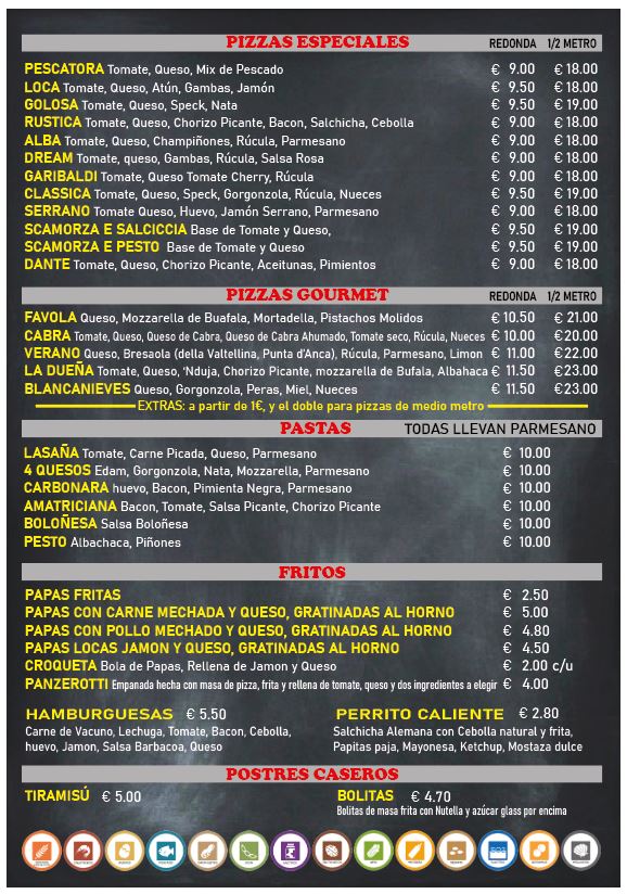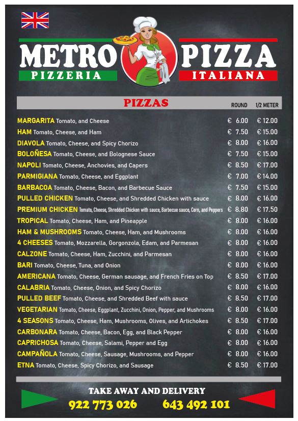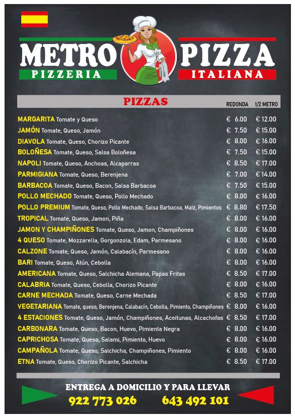 Introducing the menu at Pizzeria MetroPizza, located in the heart of Granadilla, Santa Cruz de Tenerife, this charming eatery promises a delightful experience for pizza lovers. Known for its inviting atmosphere and late-night hours, MetroPizza focuses on delivering quality Italian-style pizzas that are sure to satisfy your cravings.